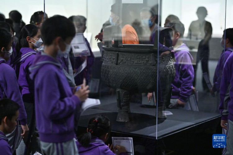 11月29日,观众在清华大学艺术博物馆观看西周时期的作宝鼎(国家一级文物)。