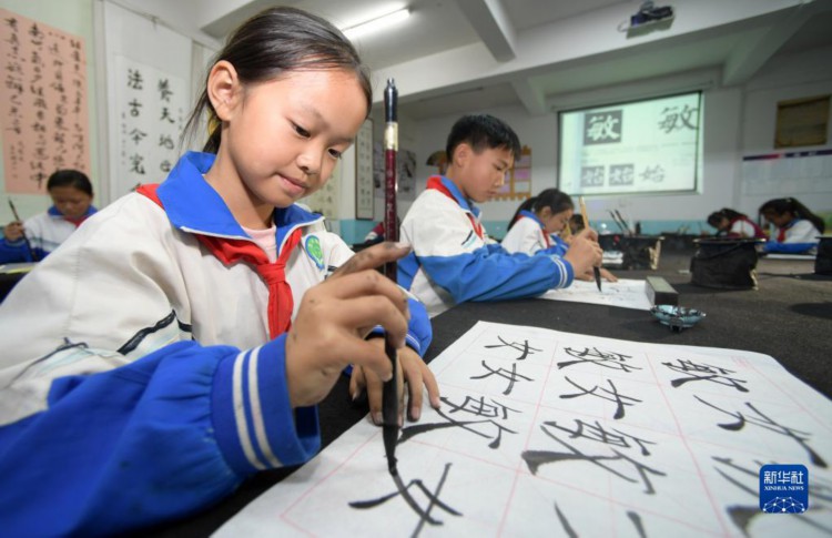 11月29日,学生在贵州省遵义市正安县第二完全小学书画室学习书法。 近年来,贵州省遵义市正安县第二完全小学利用课后服务时间,开展书法、足球、篮球、乒乓球、吉他弹奏等 “双减”课程,培养学生的兴趣爱好,提升学生的艺术修养和运动技能。自“双减”政策落地以来,正安县积极开设种类多样的课后服务活动,促进学生“德智体美劳”全面发展。 新华社记者 杨楹 摄