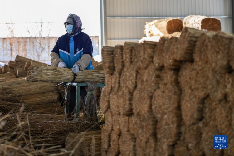 11月29日,村民在水湾镇芦苇产业园内加工芦苇。
