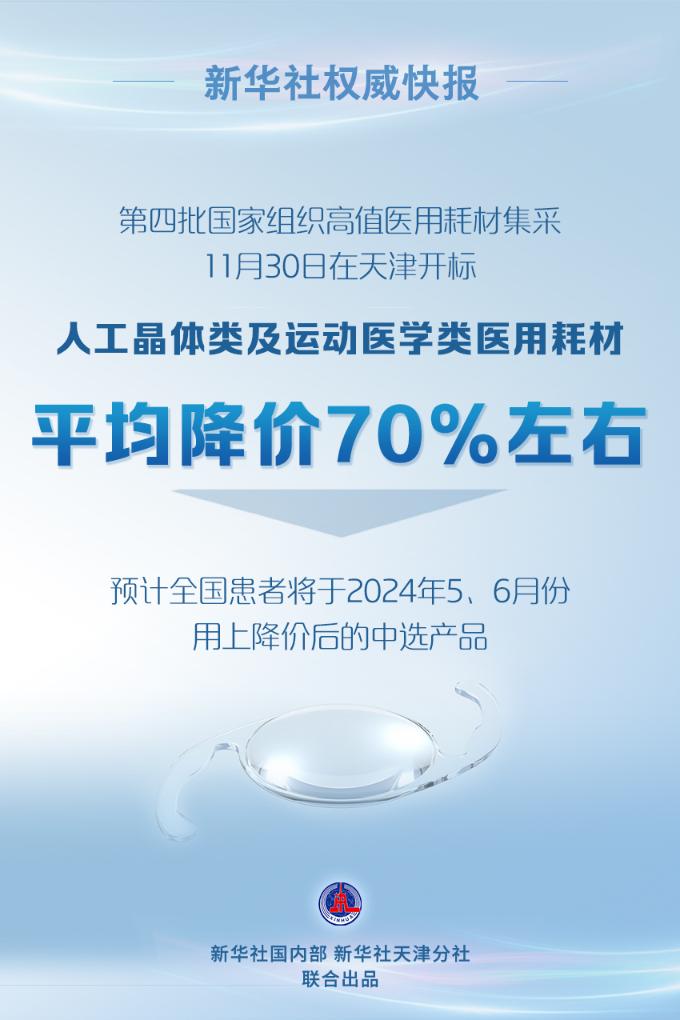 新华社天津11月30日电(记者彭韵佳、张建新)第四批国家组织高值医用耗材集采30日在天津开标,并产生拟中选结果。此次集采覆盖人工晶体、运动医学相关高值医用耗材,拟中选产品平均降价70%左右,将广泛惠及接受晶体植入的白内障患者,以及因劳动、运动肌肉韧带受损需施行运动医学手术的患者。