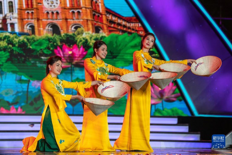 11月30日,来自越南的艺术工作者在表演舞蹈《斗笠舞》。 当日,第十一届澜沧江·湄公河流域国家文化艺术节开幕式暨文艺晚会在云南省西双版纳傣族自治州景洪市举行。来自中国、老挝、缅甸、泰国、柬埔寨、越南6国的艺术工作者表演了风情浓郁的文艺节目,让观众享受了一场视听盛宴。 新华社记者 胡超 摄