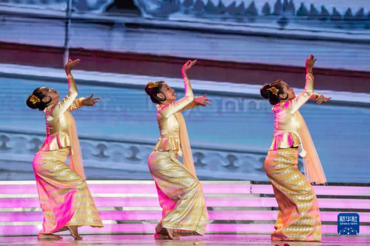 11月30日,来自缅甸的艺术工作者在表演舞蹈《吉祥如意》。 当日,第十一届澜沧江·湄公河流域国家文化艺术节开幕式暨文艺晚会在云南省西双版纳傣族自治州景洪市举行。来自中国、老挝、缅甸、泰国、柬埔寨、越南6国的艺术工作者表演了风情浓郁的文艺节目,让观众享受了一场视听盛宴。 新华社记者 胡超 摄