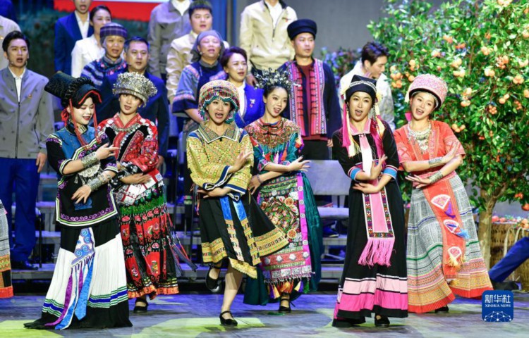 11月30日,演员在贵阳大剧院表演民族歌剧《扶贫路上》。 11月29日至30日,大型民族歌剧《扶贫路上》在贵阳大剧院上演。该剧以全国优秀共产党员、时代楷模黄文秀为创作原型,浓缩呈现全国脱贫攻坚战线上干部群众的精神风貌和共产党人的初心使命。 新华社记者 杨文斌 摄