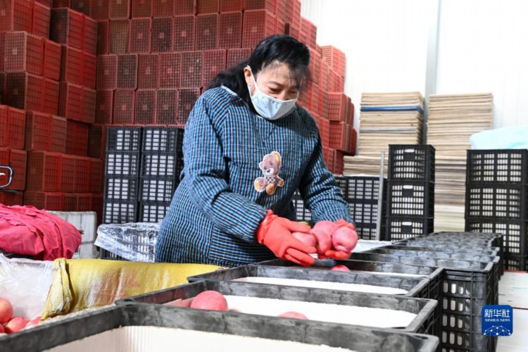 11月30日,在庆城县白马铺镇白马铺村的一处果业农民专业合作社,工作人员在苹果分拣包装线上作业。