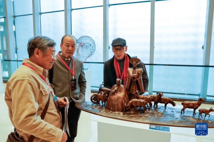 11月30日,雕塑家们在讨论首届天府雕塑展上展出的作品。