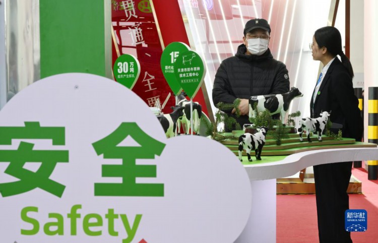 11月30日,在链博会绿色农业链展区,一位参观者(左)在天津食品集团展台前参观。 新华社记者 李贺 摄