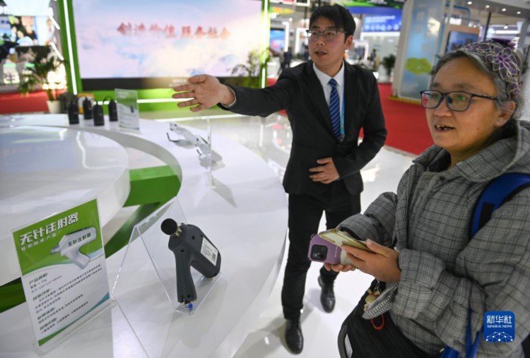11月30日,在链博会绿色农业链展区,参展商向参观者介绍一款智能设备。 新华社记者 蔡湘鑫 摄