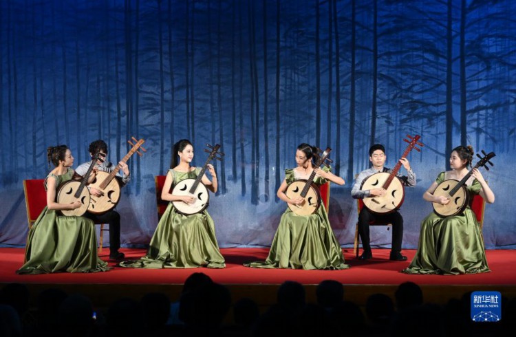 12月3日,来自中央音乐学院的演奏者在演奏阮重奏《品》。 当日,“看见明天”中国盲人协会、中国盲文出版社成立70周年公益音乐会在北京举行。 新华社记者 李贺 摄 |