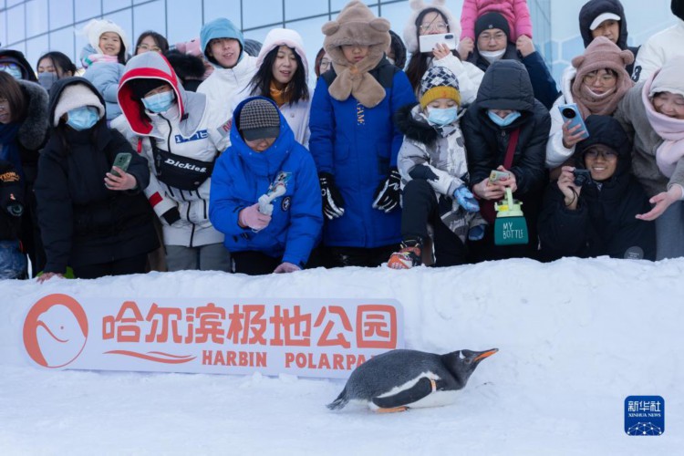 时值周末,哈尔滨极地公园的企鹅亮相户外,上演冰雪巡游,吸引许多游客前来观赏。目前正是黑龙江省哈尔滨市的冰雪旅游季。