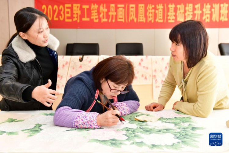 12月2日,在巨野县凤凰街道凤麟社区,来自巨野书画院的画师魏兰兰(左一)在工笔牡丹画基础提升培训班上指导学员作画。 山东省菏泽市巨野工笔牡丹画是山东省级非物质文化遗产。近年来,巨野县将工笔牡丹画作为文化“两创”的发力点和赋能乡村振兴的新引擎,编制巨野书画产业发展规划,并开展农民画师免费培育工程,努力让一幅牡丹画,绽放致富花。目前,巨野县拥有绘画从业人员2万余人,巨野工笔牡丹画远销海外。 新华社记者 郭绪雷 摄