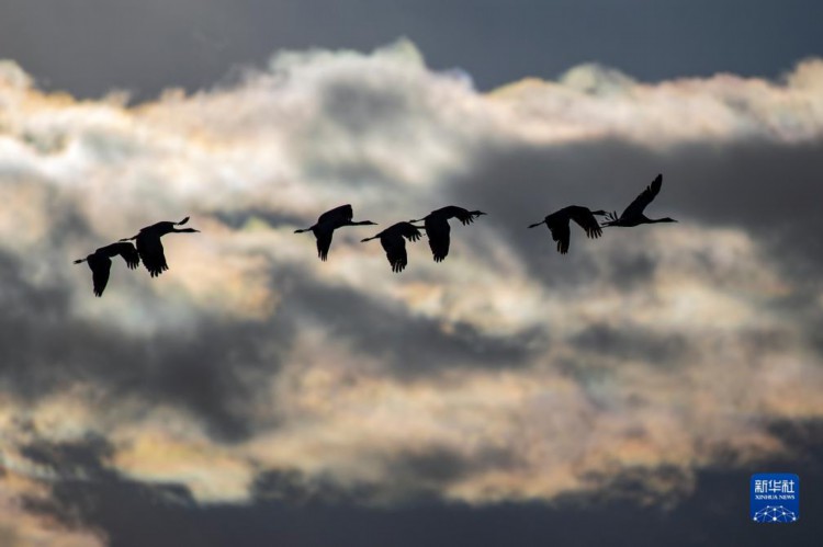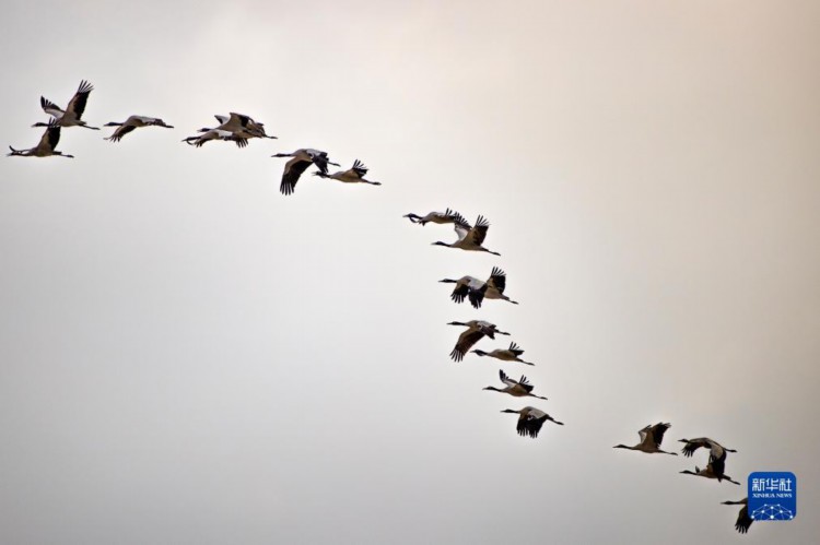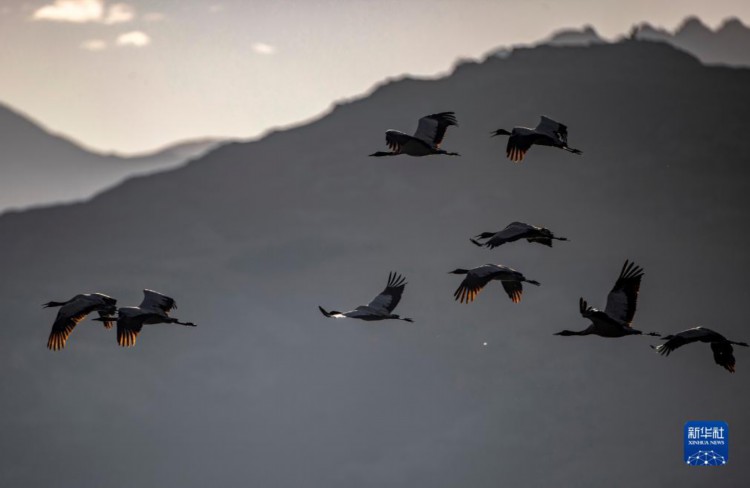 这是12月5日清晨在拉萨市林周县虎头山水库拍摄的越冬黑颈鹤。 西藏拉萨市林周县位于拉萨河上游及澎波河流域,平均海拔约4200米,是黑颈鹤的主要越冬地之一。 新华社记者 曹槟 摄