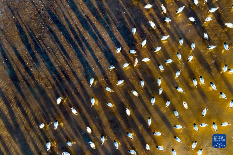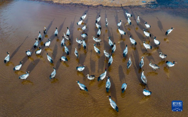 这是12月5日清晨在拉萨市林周县虎头山水库拍摄的越冬黑颈鹤(无人机照片)。 西藏拉萨市林周县位于拉萨河上游及澎波河流域,平均海拔约4200米,是黑颈鹤的主要越冬地之一。 新华社记者 姜帆 摄
