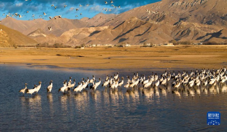 这是12月5日清晨在拉萨市林周县虎头山水库拍摄的越冬黑颈鹤。 西藏拉萨市林周县位于拉萨河上游及澎波河流域,平均海拔约4200米,是黑颈鹤的主要越冬地之一。 新华社记者 姜帆 摄