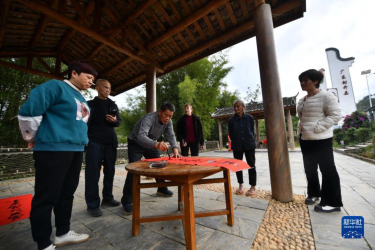 12月5日,在广西苍梧县木双镇与广东省封开县大洲镇交界的5号界碑小公园,两地村民在练习书法。