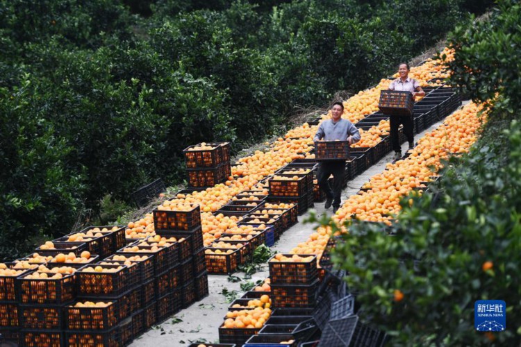 近日,贵州省罗甸县的脐橙迎来收获季,农民在脐橙种植基地采摘、搬运脐橙,供应市场。