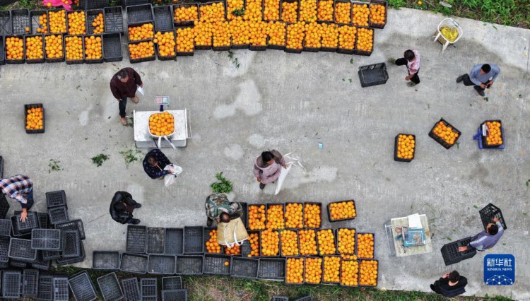 12月5日,农民在罗甸县龙坪镇脐橙基地分拣脐橙(无人机照片)。 近日,贵州省罗甸县的脐橙迎来收获季,农民在脐橙种植基地采摘、搬运脐橙,供应市场。 近年来,罗甸县因地制宜,优化农业产业结构,大力发展脐橙、火龙果、沃柑等水果种植,村民通过土地流转、务工收入、产业分红等方式实现增收。2023年,罗甸县脐橙种植面积约3.47万亩。 新华社记者 杨楹 摄