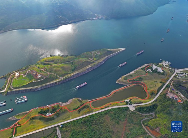 船只从大藤峡水利枢纽船闸通过(12月4日摄,无人机照片)。