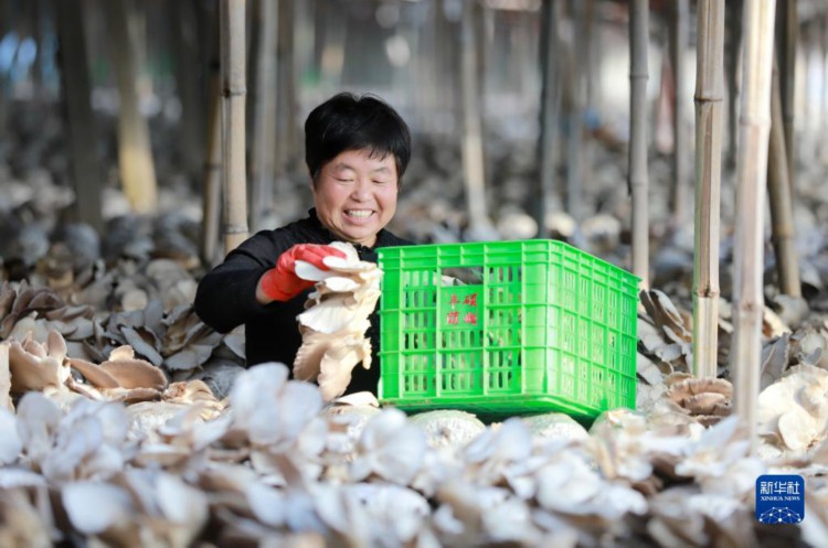 12月6日,在邯郸市肥乡区毛演堡镇路堡村,菇农在收集菌菇。