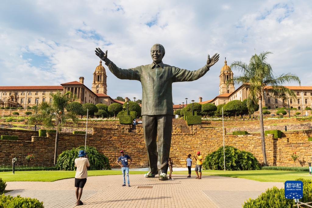 12月5日,在南非比勒陀利亚南非总统府前,人们与一座曼德拉铜像合影。