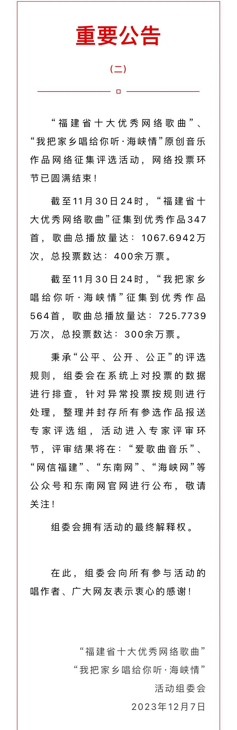 今日,“我把家乡唱给你听”活动组委会发公告,“福建省十大优秀网络歌曲”、 “我把家乡唱给你听·海峡情”原创音乐作品网络征集评选活动,网络投票环节已圆满结束!活动将进入专家评审环节,评审结果将在“爱歌曲音乐”、“网信福建”、“东南网”、“海峡网”等公众号和东南网官网进行公布。
