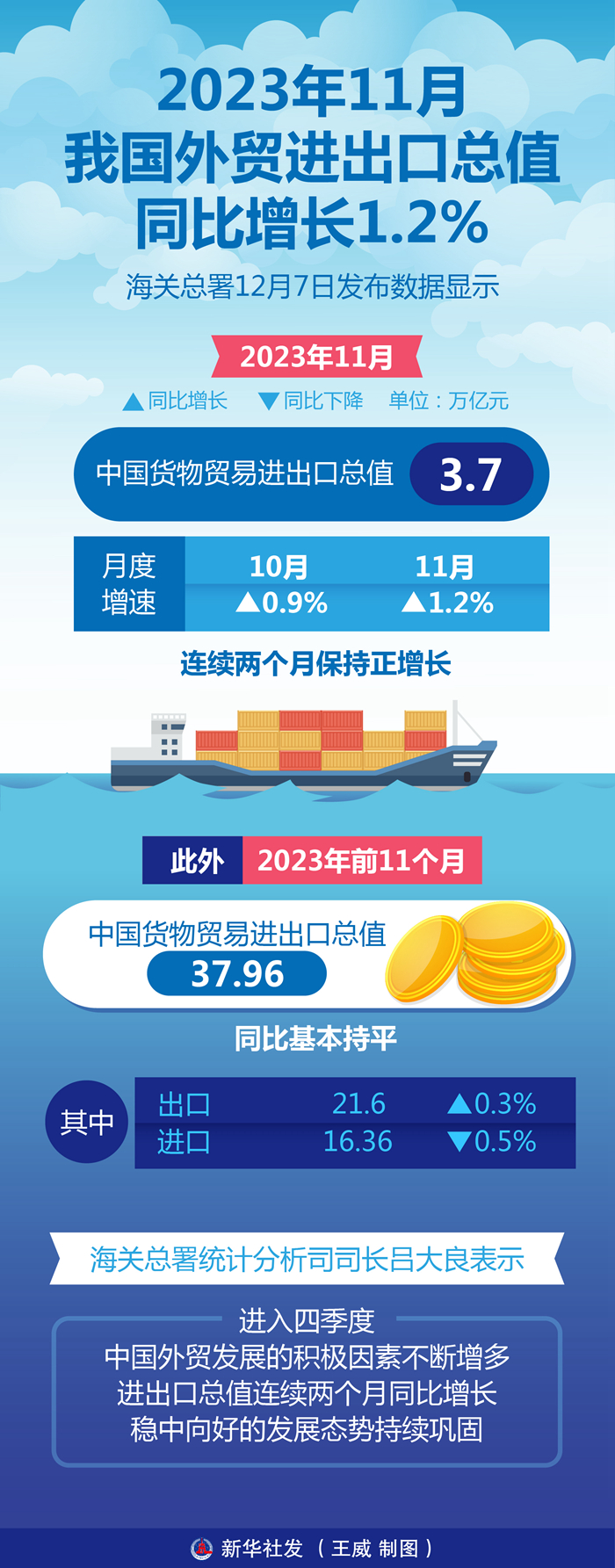 新华社北京12月7日电(记者魏弘毅)海关总署7日发布数据显示,继10月份我国货物贸易进出口增速由前期的同比下降转为增长0.9%后,11月份的货物贸易进出口增速进一步提升至1.2%,进出口总值为3.7万亿元,外贸稳中向好态势进一步巩固。