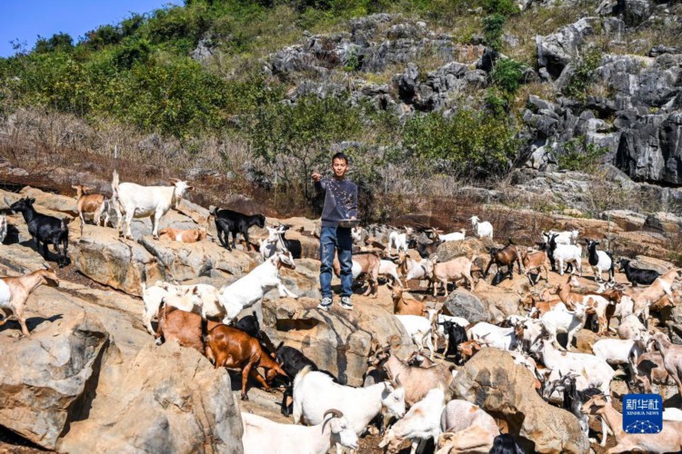 12月7日,在广西钟山县一处山羊养殖基地,村民在给山羊喂食。