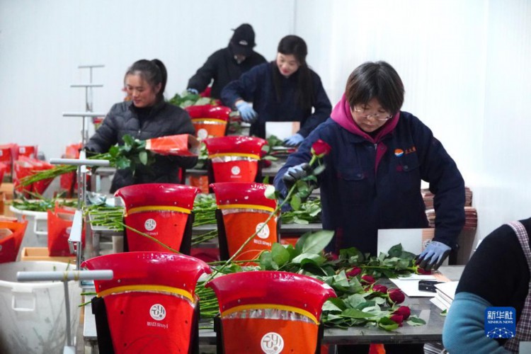 12月7日,在山东省新泰市楼德镇,工作人员在加工刚采摘的玫瑰。 近日,山东省新泰市楼德镇的大棚玫瑰进入采摘期,花农们忙着采摘、包捆、装运玫瑰,供应鲜切花市场。近年来,当地因地制宜发展大棚玫瑰种植,目前已建成高标准、智能化玫瑰种植大棚500余亩,并完善玫瑰鲜切花加工、冷藏等配套设施。 新华社记者 徐速绘 摄