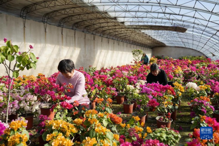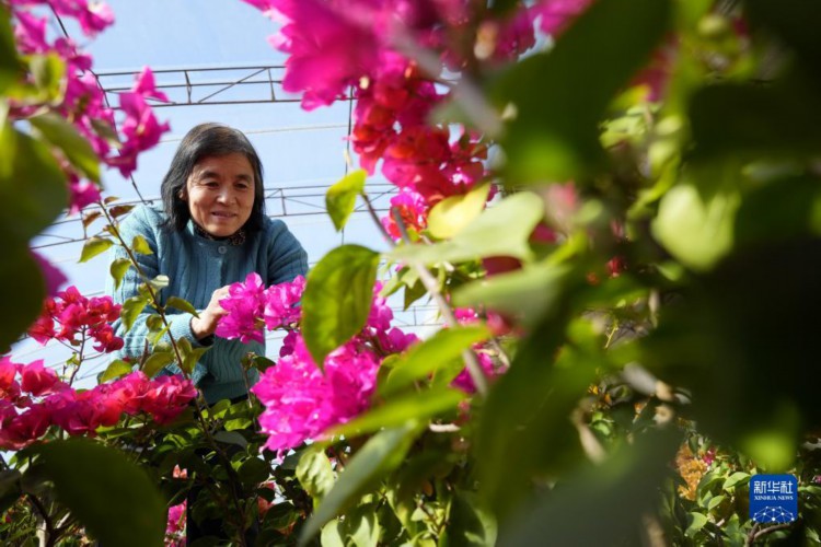 12月7日,农民在河北省唐山市丰南区黄各庄镇一处花卉种植基地内打理三角梅。 近年来,河北省唐山市丰南区结合市场需求,引导农民在冬季利用设施大棚开展花卉、云竹等观赏植物种植,并推行“线上”和“线下”相结合的销售模式,为种植户带来良好收益。目前,丰南区已建立特色观赏植物种植基地20余个。 新华社记者 牟宇 摄