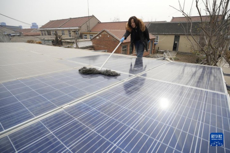 12月10日,河北省玉田县林头屯乡东芦庄村村民在清洁自家房顶的光伏发电板。
