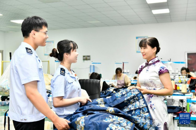 在山东曹县辰霏服饰有限公司,曹县税务局的工作人员上门走访,介绍减税降费助企发展相关优惠政策(2023年7月6日摄)。新华社记者 郭绪雷 摄