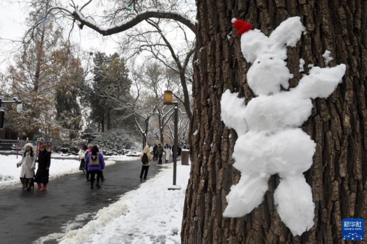 游客在北海公园一棵树上用雪堆出兔子造型(12月11日摄)。
