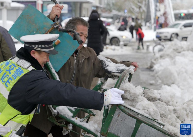 12月11日,在郑州市花园路上,交警和市民清除道路积雪。 12月10日至11日,受强冷空气影响,河南迎来今冬首轮大范围雨雪天气,其中郑州市出现暴雪,局部大暴雪。 新华社记者 李嘉南 摄