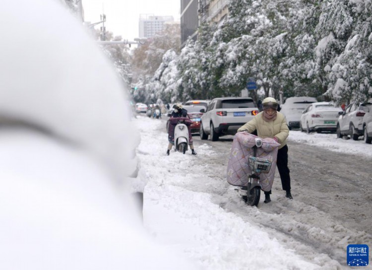 12月11日,市民在郑州市纬三路上推行电动自行车。 12月10日至11日,受强冷空气影响,河南迎来今冬首轮大范围雨雪天气,其中郑州市出现暴雪,局部大暴雪。 新华社记者 李嘉南 摄