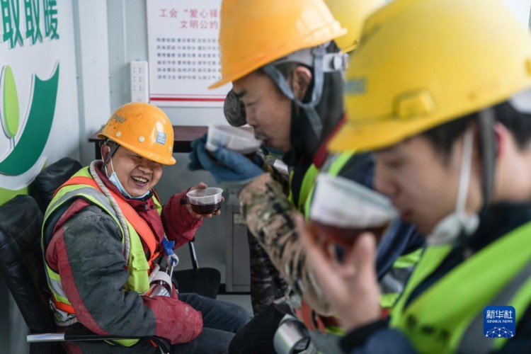 12月12日,在位于北京市海淀区的一处工地上,工人在喝姜茶驱寒。