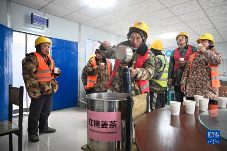 12月12日,在中建二局北方公司天津泰康项目工地,工人在饮用为他们准备的红糖姜茶驱寒。