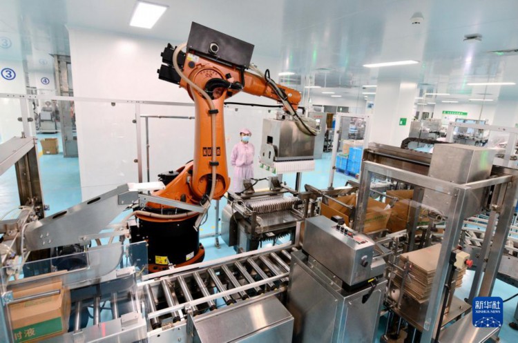 12月12日,在石家庄市栾城区神威药业集团的注射剂生产车间,机器人在进行小盒装箱工作。