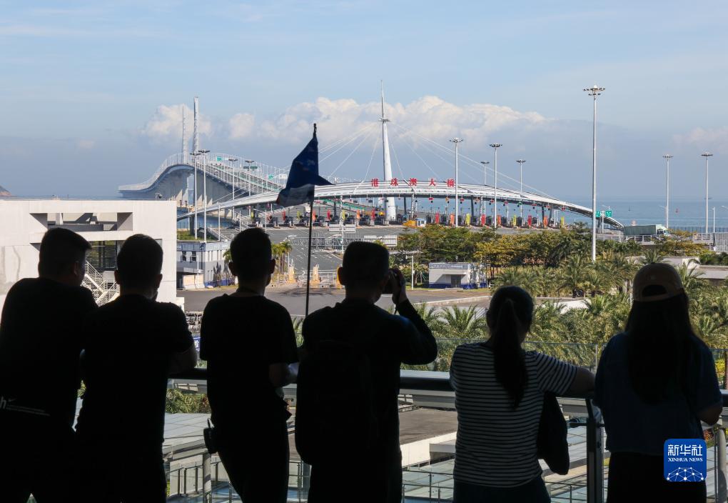 12月15日,游客在港珠澳大桥珠海公路口岸远眺大桥。