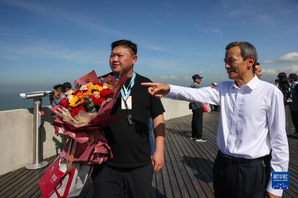 12月15日,来自北京的张岩(左)成为首位登上港珠澳大桥东人工岛的游客,港珠澳大桥管理局局长郑顺潮(右)向他介绍大桥情况。