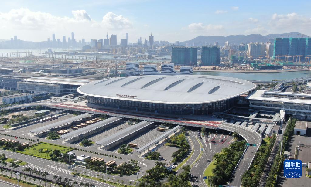 这是12月15日拍摄的港珠澳大桥珠海公路口岸及远处的澳门(无人机照片)。