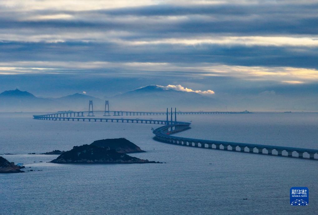 晨曦中的港珠澳大桥(12月15日摄,无人机照片)。