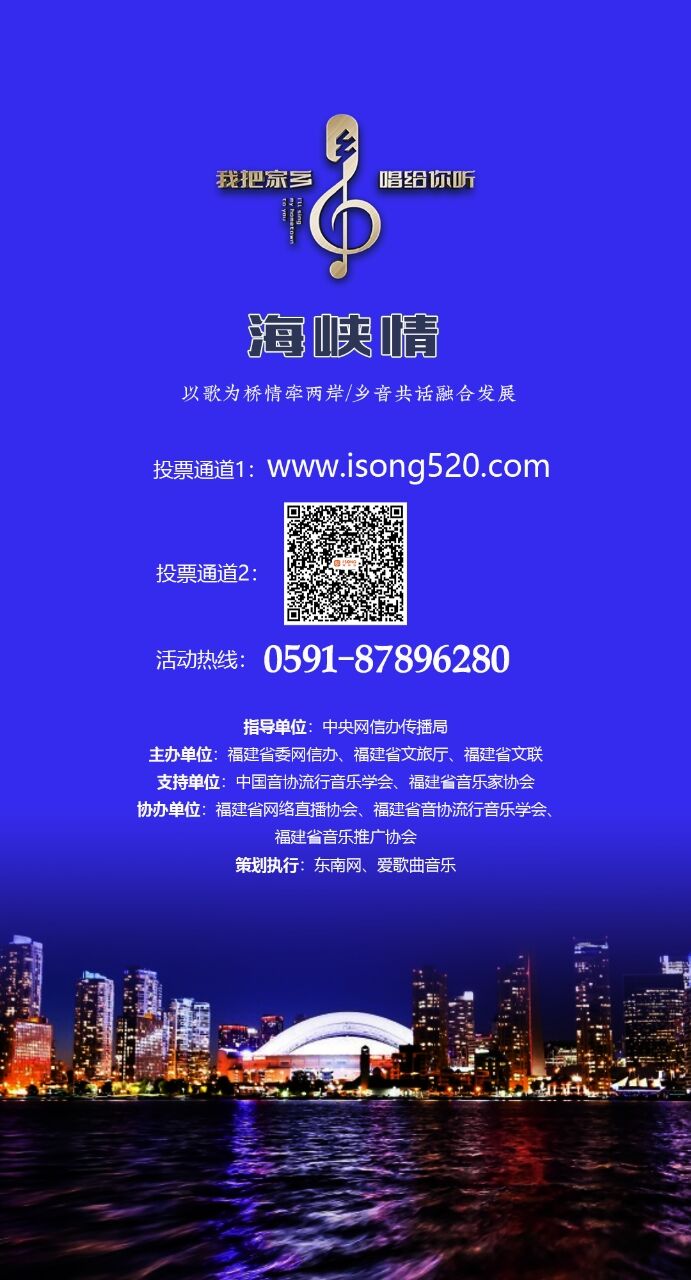 “我把家乡唱给你听·海峡情“海峡两岸音乐作品网络征集评选活动网络投票环节已经结束,进入专家评审阶段。本届活动共征集到的歌曲574首,其中台湾音乐人投稿117首。 组委会将从征集到的参赛作品中,挑选出部分歌曲进行在东南网、海峡网、闽南网、QQ音乐等平台矩阵展播,并在抖音、视频号等平台,用媒体官方号、组委会官方号全方位推送展示。 “我把家乡唱给你听·海峡情”海峡两岸音乐作品网络征集评选活动由中央网信办传播局指导,省委网信办、省文旅厅、省文联主办,东南网承办,福建省音协流行音乐学会、省音乐推广协会、省网络直播协会协办。中国互联网发展基金会中国正能量网络传播专项基金资助支持。
