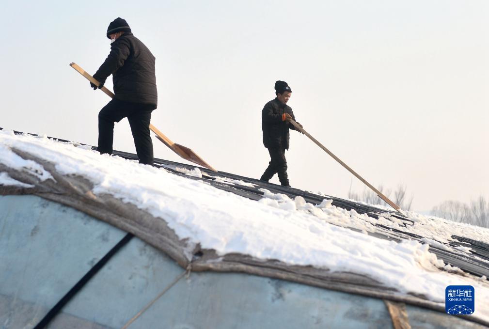 12月18日,石家庄市元氏县南佐村种植户在清理大棚上的积雪。