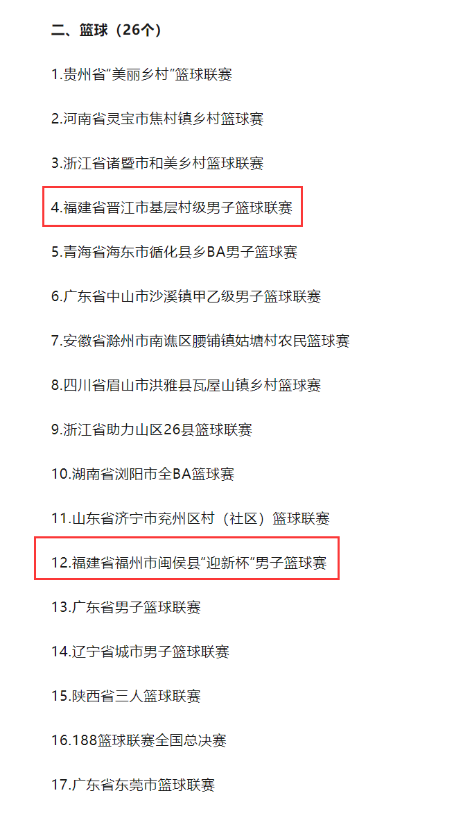 近日,国家体育总局群体司对首批群众“三大球”精品赛事案例名单进行公示,其中,福建有两项赛事入选分别是:福建省晋江市基层村级男子篮球联赛、福建省福州市闽侯县“迎新杯”男子篮球赛。