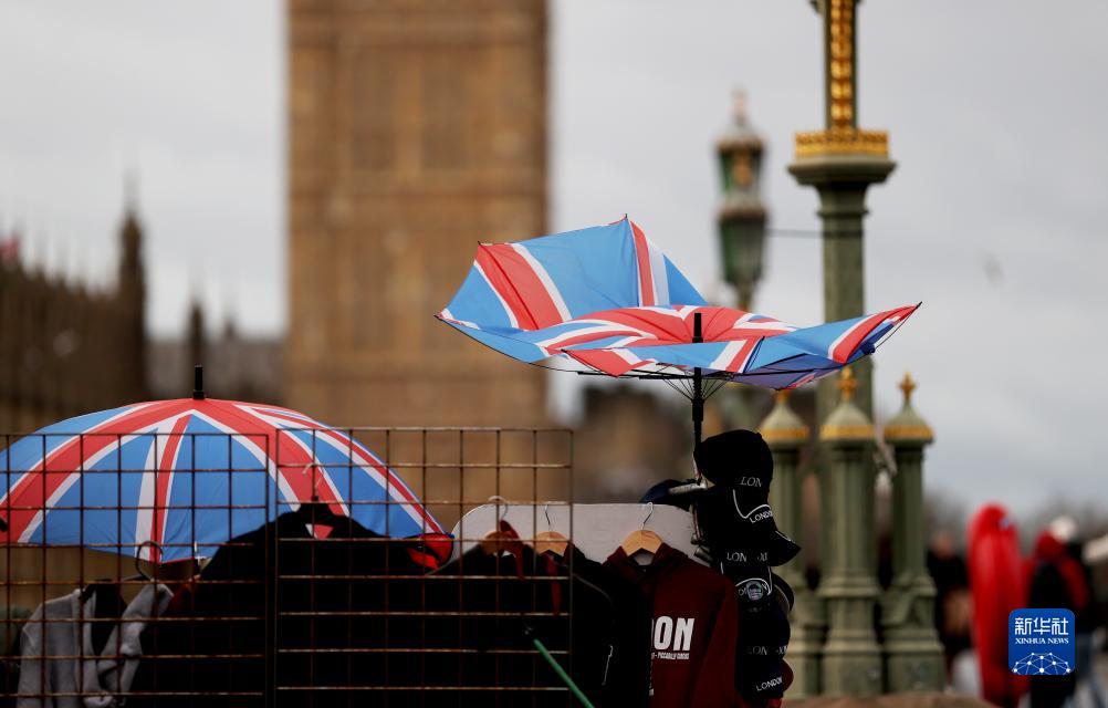 12月21日,在英国伦敦,一处摊位售卖的雨伞被大风吹翻。