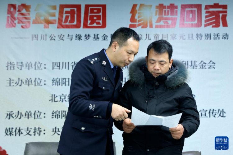 12月28日,在成都举行的认亲活动中,四川省绵阳市公安局胡祥雨工作室负责人胡祥雨(左)向陈顺展示其身份确认通知书。 1988年,四川省绵阳市的小男孩薛小军被拐至江苏并改名陈顺。他深藏着对养蜂人父母的记忆,长大后四处寻亲。多年来,他的亲生父母也在苦苦找他。2023年,陈顺通过四川省绵阳市公安局胡祥雨工作室采集了生物信息。警方通过一系列走访核实、生物信息采集等工作,最终比对成功,绵阳北川薛明贵、周本英夫妇与江苏陈顺系父母子女关系。失散35年的家人终得团聚。 新华社记者 沈伯韩 摄