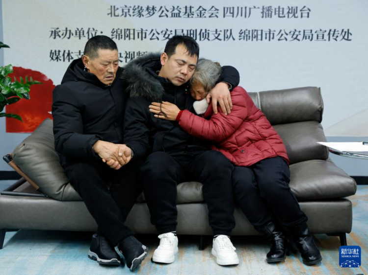 12月28日,在成都举行的认亲活动中,陈顺(中)与父亲薛明贵、母亲周本英相见。 1988年,四川省绵阳市的小男孩薛小军被拐至江苏并改名陈顺。他深藏着对养蜂人父母的记忆,长大后四处寻亲。多年来,他的亲生父母也在苦苦找他。2023年,陈顺通过四川省绵阳市公安局胡祥雨工作室采集了生物信息。警方通过一系列走访核实、生物信息采集等工作,最终比对成功,绵阳北川薛明贵、周本英夫妇与江苏陈顺系父母子女关系。失散35年的家人终得团聚。 新华社记者 沈伯韩 摄
