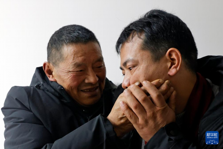 12月28日,在成都举行的认亲活动中,父亲薛明贵抚摸着儿子陈顺(右)的脸颊。薛明贵如今视力障碍,只能靠摸来“看见”儿子。 1988年,四川省绵阳市的小男孩薛小军被拐至江苏并改名陈顺。他深藏着对养蜂人父母的记忆,长大后四处寻亲。多年来,他的亲生父母也在苦苦找他。2023年,陈顺通过四川省绵阳市公安局胡祥雨工作室采集了生物信息。警方通过一系列走访核实、生物信息采集等工作,最终比对成功,绵阳北川薛明贵、周本英夫妇与江苏陈顺系父母子女关系。失散35年的家人终得团聚。 新华社记者 沈伯韩 摄