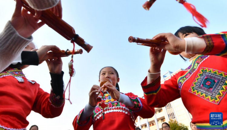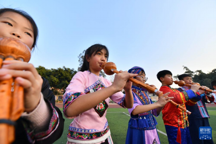 12月28日,在柳州市融安县实验小学,学生们在练习吹奏葫芦丝。 近年来,广西柳州市在开展民族团结进步文化进校园活动中,将葫芦丝、竹竿舞、芦笙、书法、山歌等传统文化引进课堂,让孩子们在传承优秀中华文化的同时,接受民族团结进步教育,铸牢中华民族共同体意识。 新华社记者 黄孝邦 摄