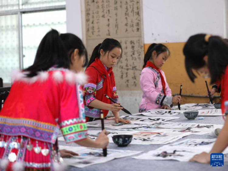 12月28日,在柳州市融安县实验小学,学生们在练习书法。 近年来,广西柳州市在开展民族团结进步文化进校园活动中,将葫芦丝、竹竿舞、芦笙、书法、山歌等传统文化引进课堂,让孩子们在传承优秀中华文化的同时,接受民族团结进步教育,铸牢中华民族共同体意识。 新华社记者 黄孝邦 摄