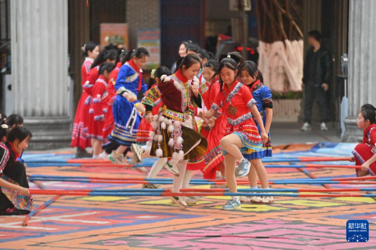 12月28日,在柳州市融安县实验小学,学生们在跳竹竿舞。 近年来,广西柳州市在开展民族团结进步文化进校园活动中,将葫芦丝、竹竿舞、芦笙、书法、山歌等传统文化引进课堂,让孩子们在传承优秀中华文化的同时,接受民族团结进步教育,铸牢中华民族共同体意识。 新华社记者 黄孝邦 摄